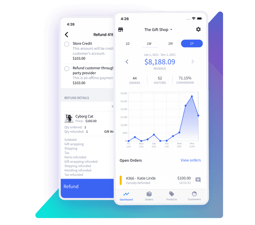 Check key performance metrics, view and update orders, and manage customers on-the-go with the BigCommerce mobile app. It’s free to download from the Apple App Store and Google Play Store.