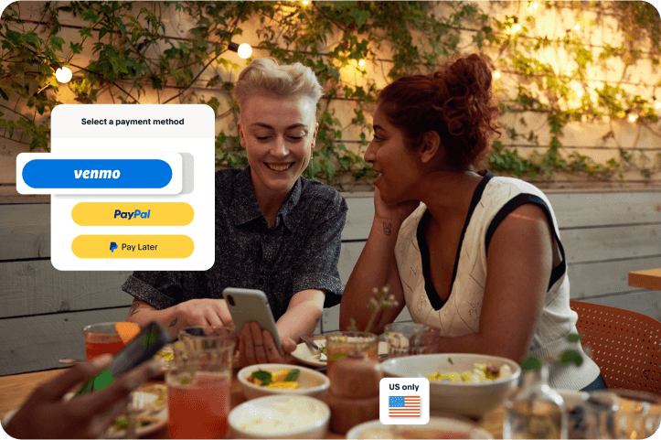 Venmo (US only) is already part of your integration — at no additional cost. Gain appeal to Venmo (US only) customers by letting customers pay for purchases the same way they pay their friends. And help bring more visibility to your business with a payment method customers can easily share.