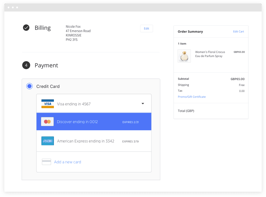 Allow your customers to choose from a list of their saved credit cards and billing addresses allowing them to choose however they wish to pay.