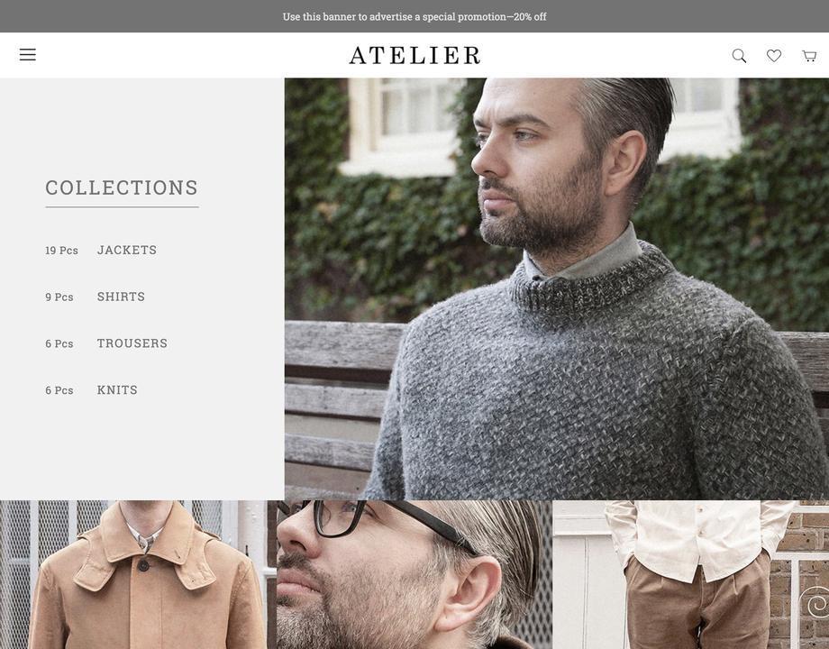 Atelier is truly one of a kind. Its cutting-edge design and high-class editorial feel are like no other theme on the market. Guaranteed to make your business stand out online, Atelier puts a premium on stunning, full-width imagery, with a unique navigation menu and gorgeous homepage product grid. It's the definition of style.