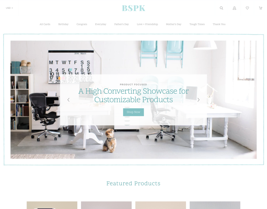Bespoke is a fresh and versatile theme optimized for stores with customizable products. Its clean design and stylish homepage layout create a striking first impression, while intuitive product configuration flows help customers tailor their purchases to their needs and preferences. Whether you sell stationery, artwork, or food products, Bespoke provides a smooth and satisfying experience for your customers.