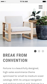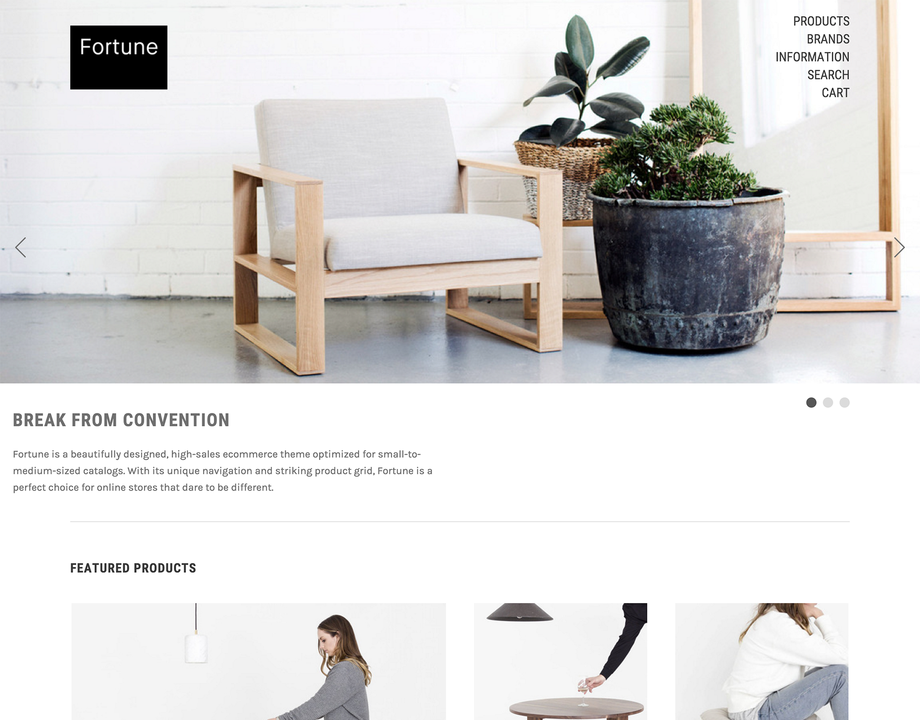Fortune is a standout theme for cutting-edge online stores. Customers will be transfixed by its striking hero area, which puts your imagery on full display, along with its sleek navigation and unique product grid. Ideal for small-to-medium-sized catalogs, Fortune has everything you need to command and convert shoppers.