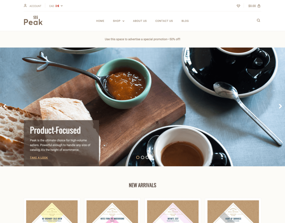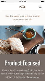 Peak is the ultimate choice for high-volume sellers. Powerful enough to handle any size of catalog, Peak's clean design supports a wide range of products and industries. Toggle between featured and best-selling items on your homepage, advertise promotions in a sales-ready slideshow, and convert customers with a theme that's the height of ecommerce.