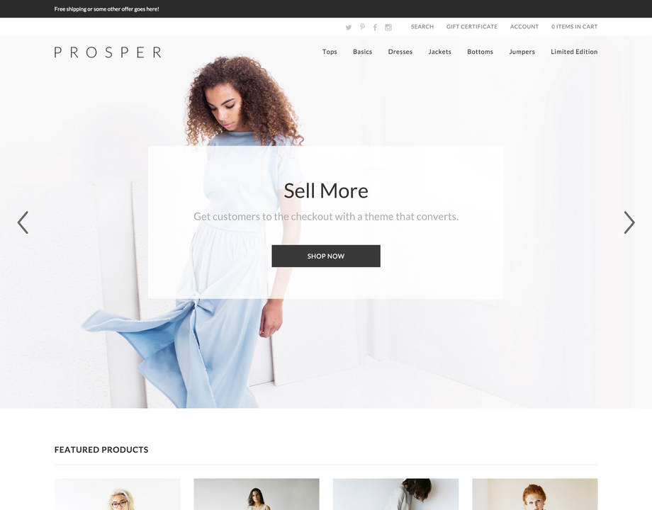Prosper is the kind of theme you build your business around. Designed to scale, it is defined by its stylish, long-format homepage, engaging product presentation, and beautiful typography. Accessible to both merchants and shoppers, Prosper is quick to set up and offers an array of branding and customization options.