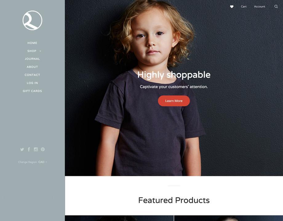 Runway is a gallery theme for stores with exceptional style. Create a memorable first impression with stunning full-width images, tidy sidebar navigation, and homepage features designed to invite customer engagement. Elegant and understated, Runway is a perfect backdrop for your high-end products.