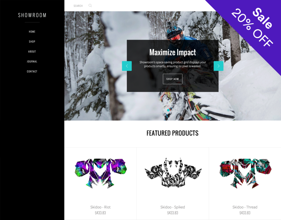 Showroom is a sleek and sophisticated theme designed to keep pace with scaling businesses. Its unique space-saving product grid and customizable sidebar navigation combine to create a theme that's both elegant and powerful. Ideal for any brand, Showroom is easy to set up and infinitely shoppable.