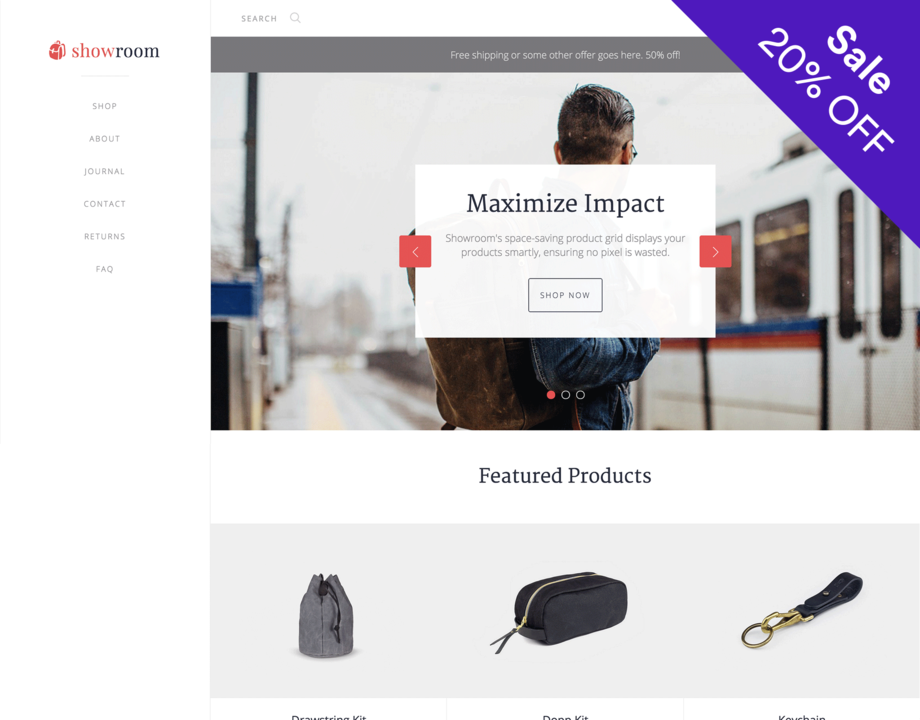 Showroom is a sleek and sophisticated theme designed to keep pace with scaling businesses. Its unique space-saving product grid and customizable sidebar navigation combine to create a theme that's both elegant and powerful. Ideal for any brand, Showroom is easy to set up and infinitely shoppable.
