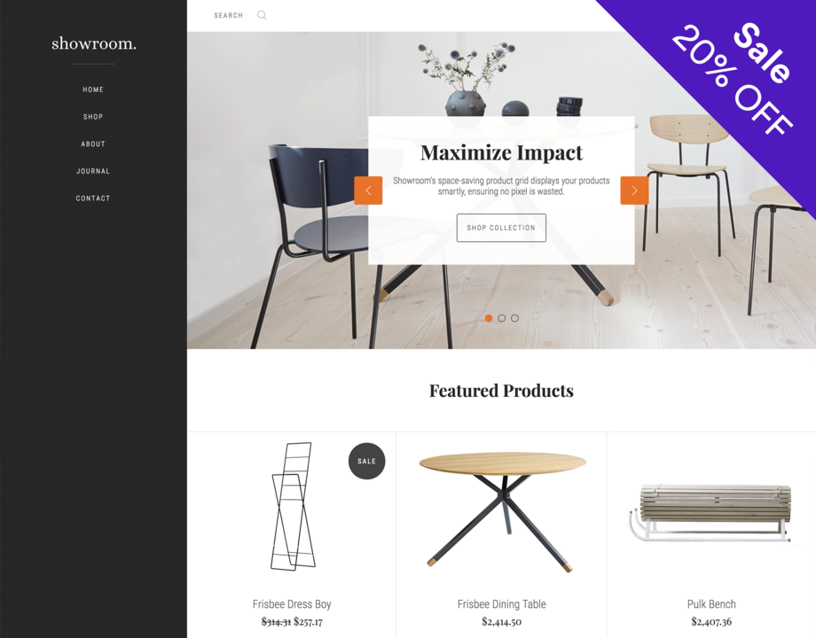 Showroom is a sleek and sophisticated theme designed to keep pace with scaling businesses. Its unique space-saving product grid and customizable sidebar navigation combine to create a theme that's both elegant and powerful. Ideal for any brand, Showroom is easy to set up and infinitely shoppable.
