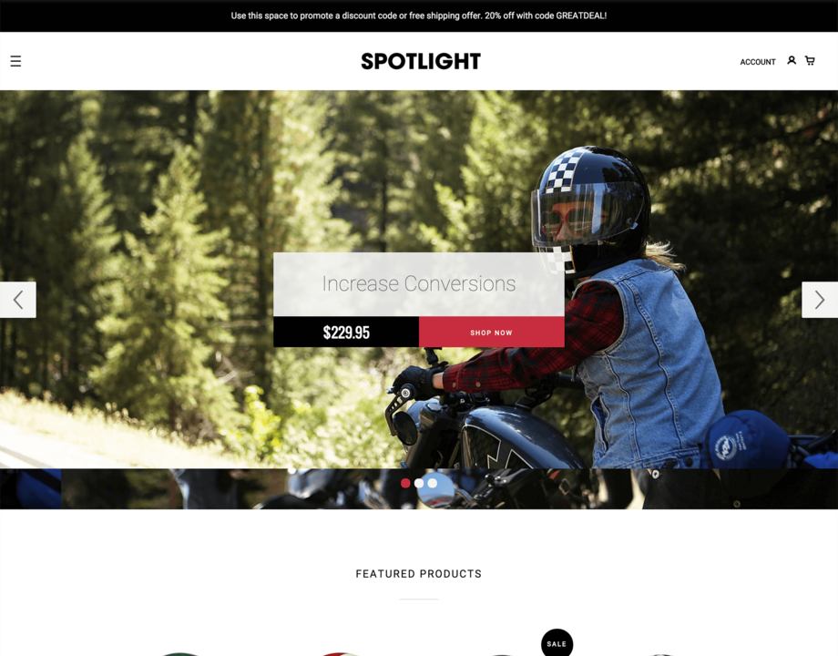 Spotlight is a bold and engaging theme designed to feature your top products and promotions. Its homepage combines stunning, full-width imagery with prominent promotion boxes, customer reviews and quick-add-to-cart functionality. Easily customizable, Spotlight puts the focus on what matters most—driving sales.